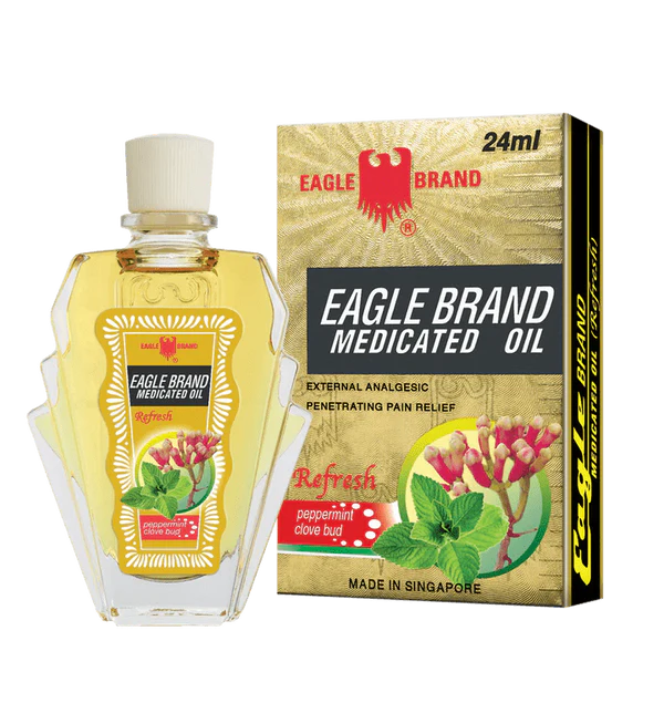 Eagle Brand Refresh Medicated Oil made from a special blend of of peppermint and clove bud oil to soothe and refresh. It helps relieve minor aches, pains, headaches, and giddiness.